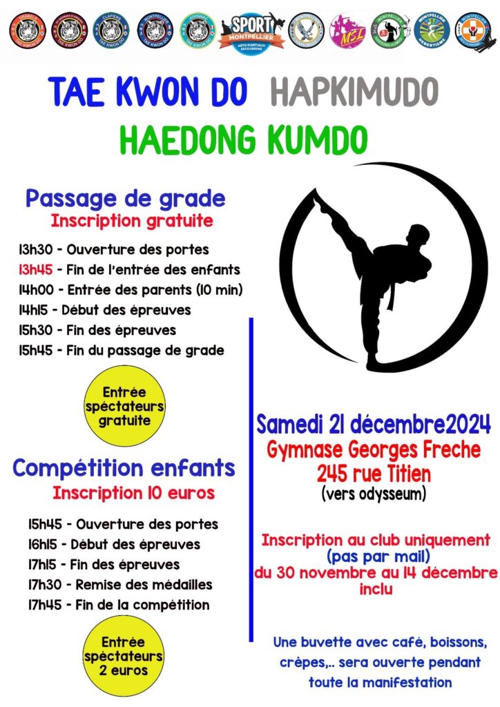 Le passage de grade et la compétition enfant se dérouleront le 20 décembre au Gymnase Georges Frêche (245 rue le